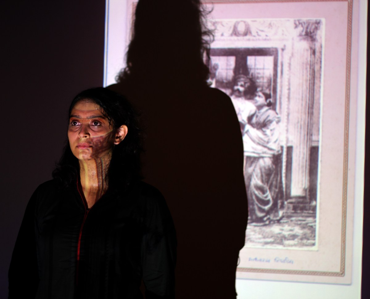 Anuja Ghosalkar during a performance of ‘Lady Anandi’ at the Beagle’s Loft, Bangalore, organised by Sandbox Collective. Image credit: Jazeela Basheer.