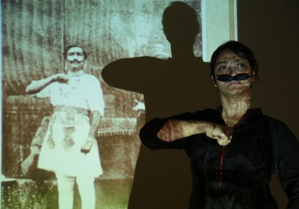 You use projections of archival photographs of your great grandfather throughout the play, often projecting them onto your own body. Like him, you slip fluidly in and out of differently gendered bodies throughout the play. It’s no surprise you premiered Lady Anandi at the Gender Bender theatre festival presented by the Goethe-Institut with Max Mueller Bhavan and the Sandbox Collective! Can you speak a little on your use of these photographs, your body, and the place of gender in the play?